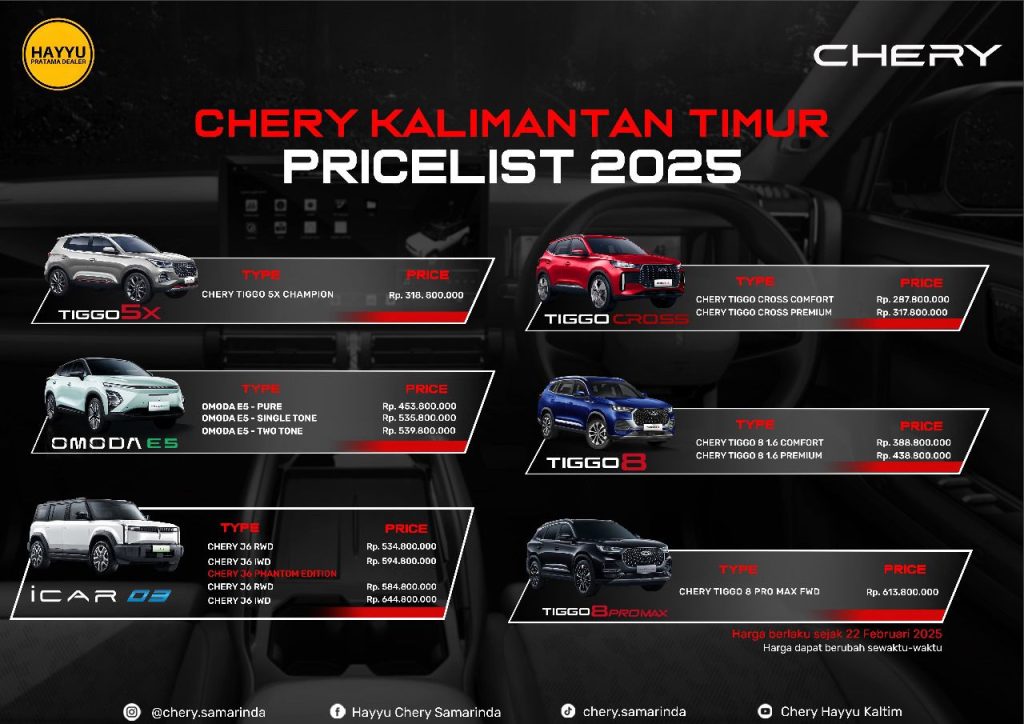 Chery Samarinda KalTim selalu memberikan penawaran menarik untuk pembelian unit mobil Chery. Selalu ada Promo di Chery Samarinda KalTim untuk setiap bulannya. Dapatkan semua mulai dari DP Murah / Cicilan Ringan / Promo Menarik, dan berbagai macam penawaran menarik lainnya hanya di Chery Samarinda KalTim.